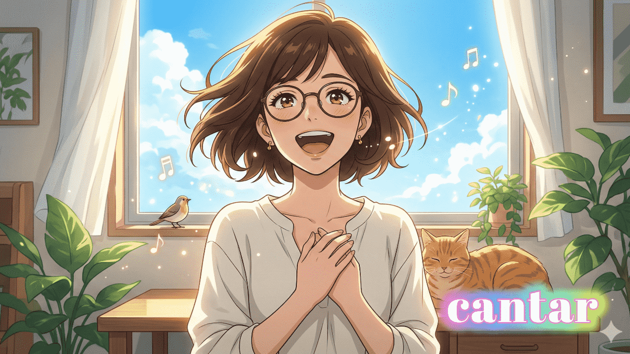 スペイン語の動詞 cantar のすべての活用と基本的な意味を紹介しています。